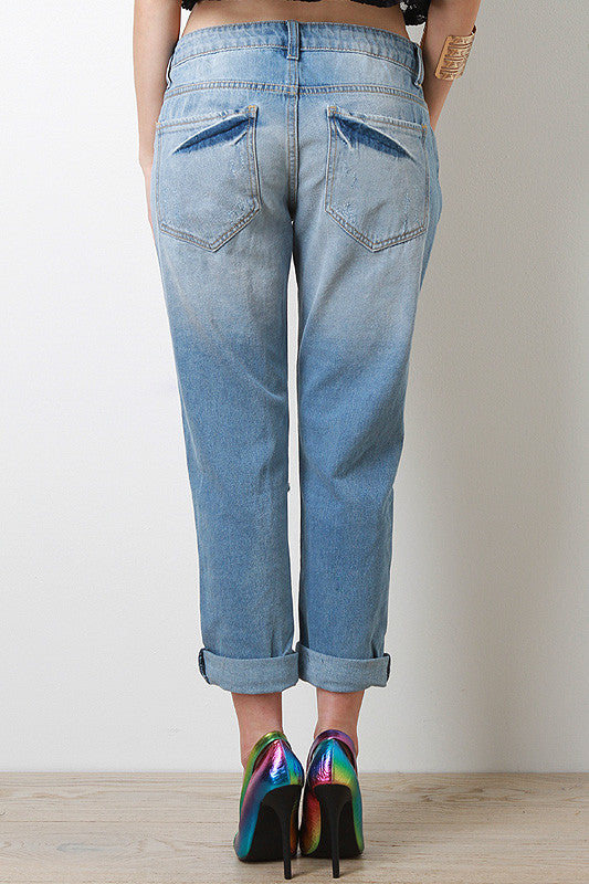 Boyfriend jean featuring destroyed design down the front, five pocket design, stitching details, cropped length, belt loops, single button with zip fly closure. Accessories sold separately. 100% Cotton.