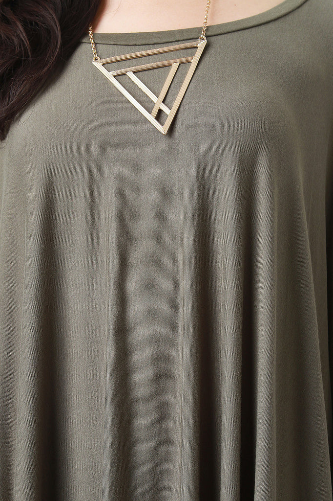 This jersey knit top features a round neckline, boxy cut fit, and an asymmetrical hemline. Accessories sold separately. Made in U.S.A. 95% Rayon, 5% Spandex.