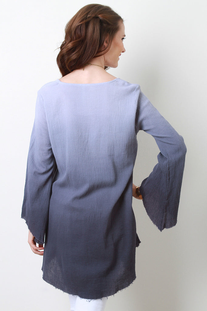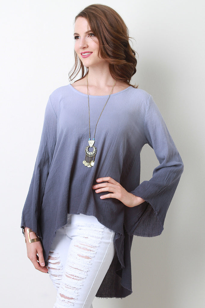 Featuring crepe texture ombre fabric, round neckline, long slanted bell sleeves, raw edges, and high-low hemline. Accessories sold separately. Made in U.S.A. 100% Cotton.