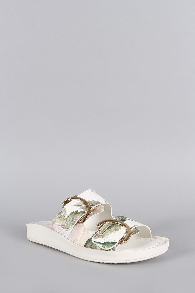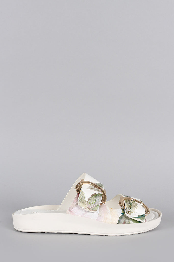 This slip on flat sandal features an open toe design, floral print leatherette strap with double buckle accent, and cushioned insole for comfort.