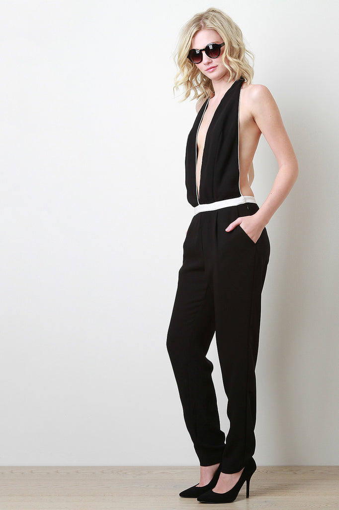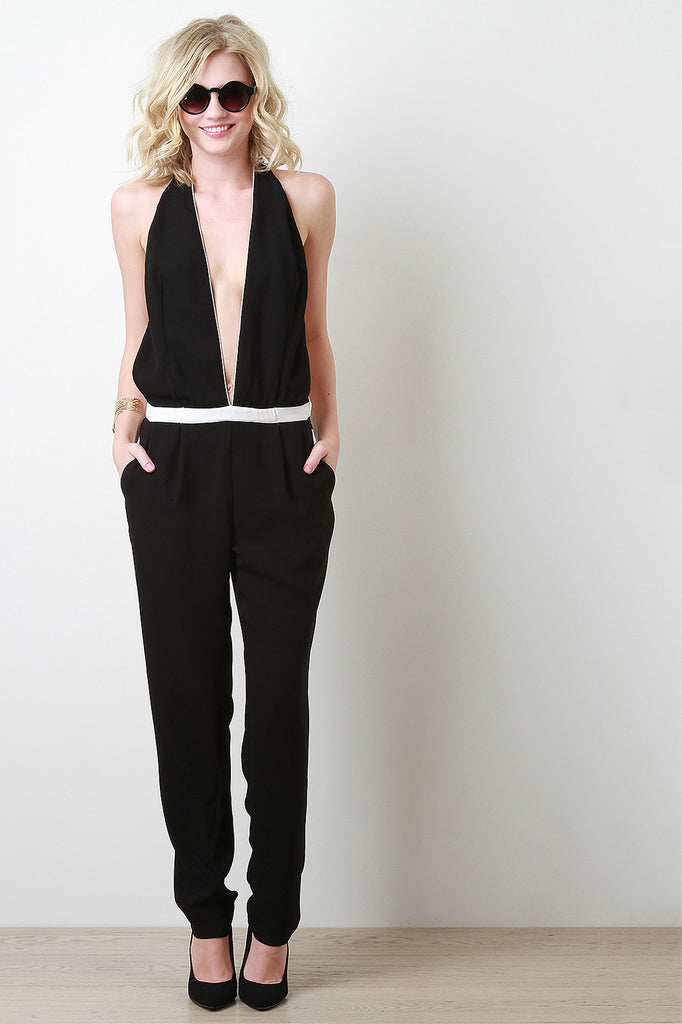 This jumper features plunge neckline, halter design, single strap down back with adjustable button closure, two pockets, and finished with hidden side zipper closure. Accessories sold separately. 100% Polyester.