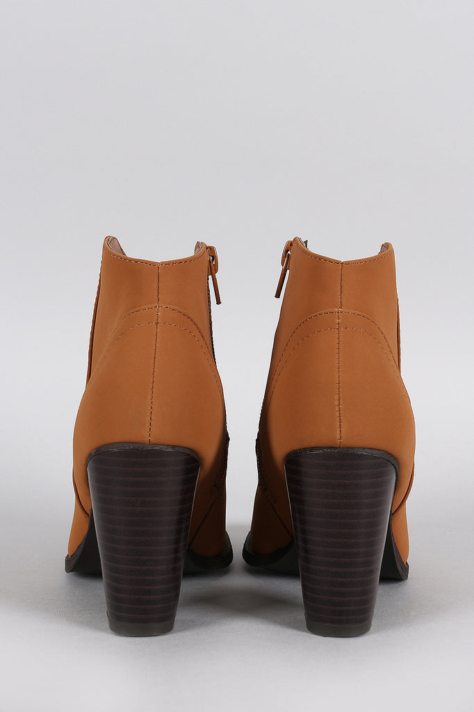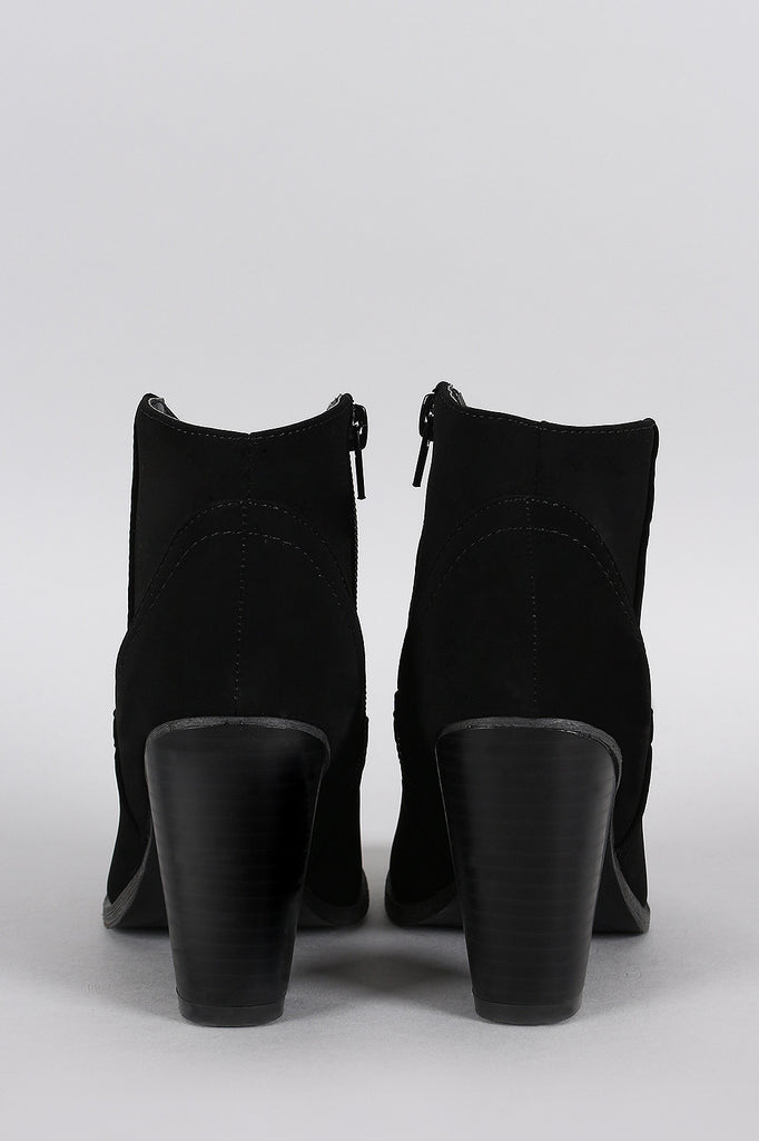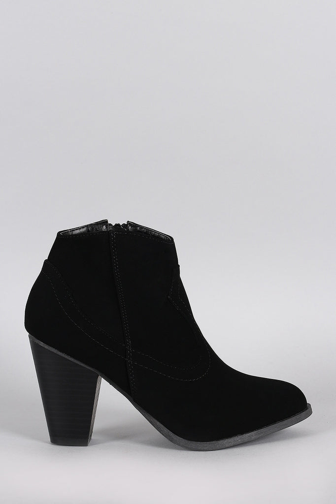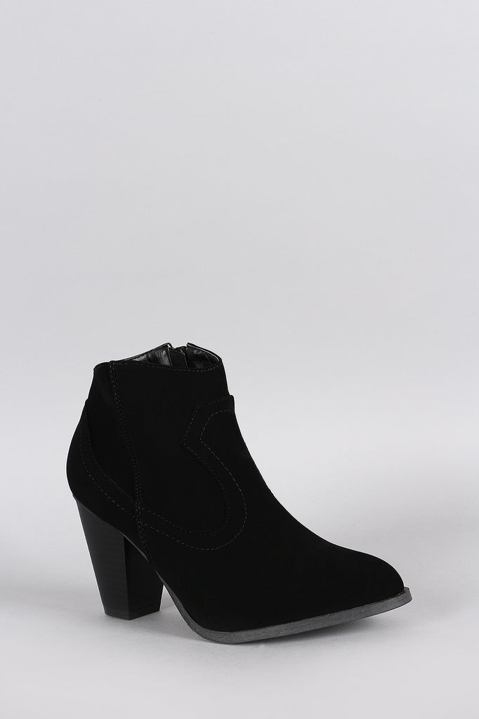 This ankle bootie features an almond toe silhouette, smooth nubuck upper with stitching accent, and chunky stacked heel. Finished with lightly cushioned insole and side zipper closure for easy on/off.
