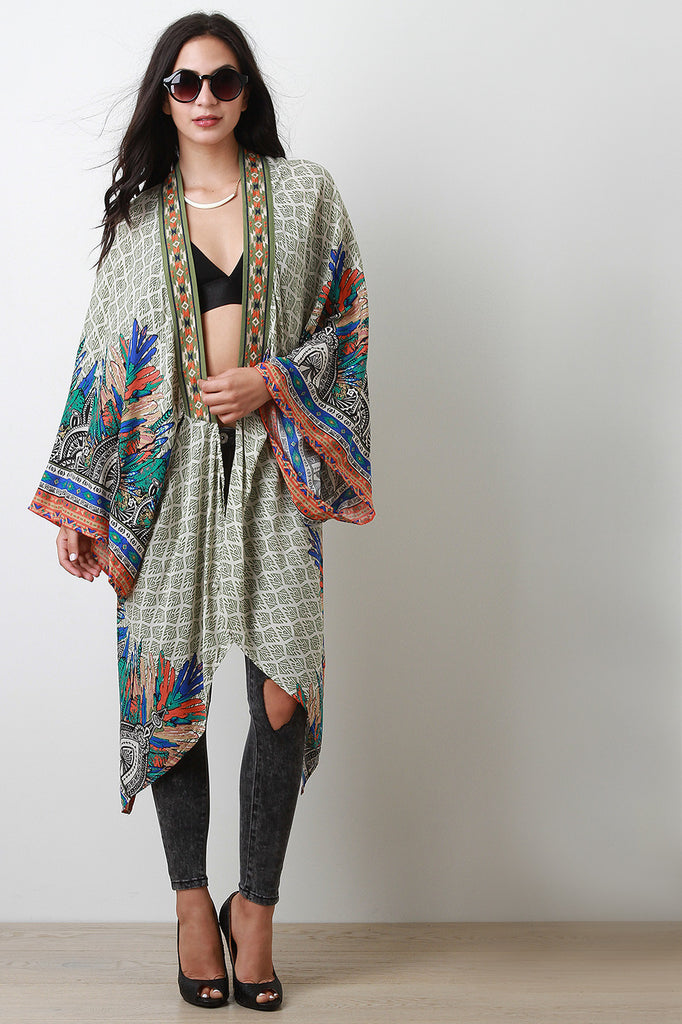 This kimono features tribal print , open front, geo pattern stitched lapels, long wide sleeves, longline construction, and finished with asymmetrical hemline. Accessories sold separately. Self: 100% Rayon. Contrast: 100% Rayon.