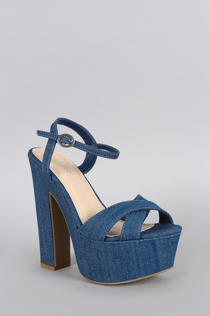 This heel features a peep toe silhouette, crisscrossing strap design at front vamp, covered chunky platform, and heel. Finished with lightly padded insole and adjustable ankle strap with buckle fastening.