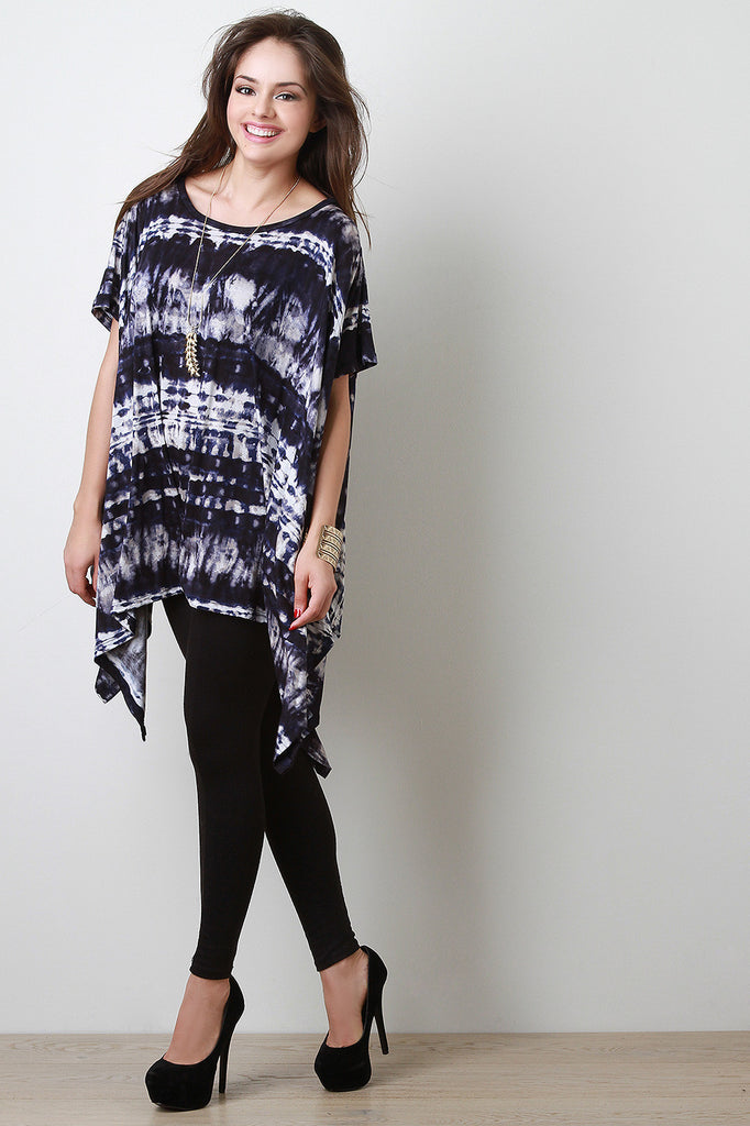 This casual top features tie dye print on soft jersey knit, round neckline, short dolman sleeves, relaxed fit, and finished with handkerchief hemline. Accessories sold separately. Made in U.S.A. 100% Rayon.