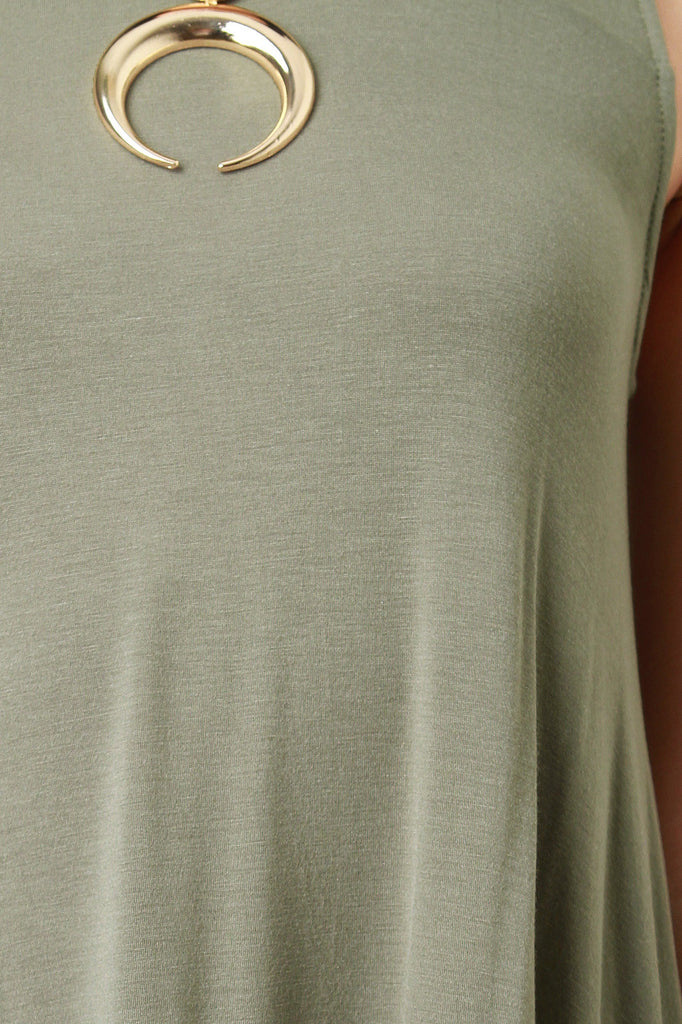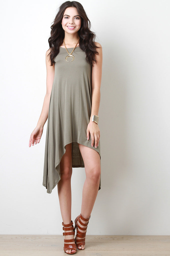 This sleeveless jersey knit dress features a round neckline, shift cut fit, sharkbite midi length hemline, and horizontal seam at yoke. Accessories sold separately. Made in U.S.A. 95% Modal, 5% Spandex.