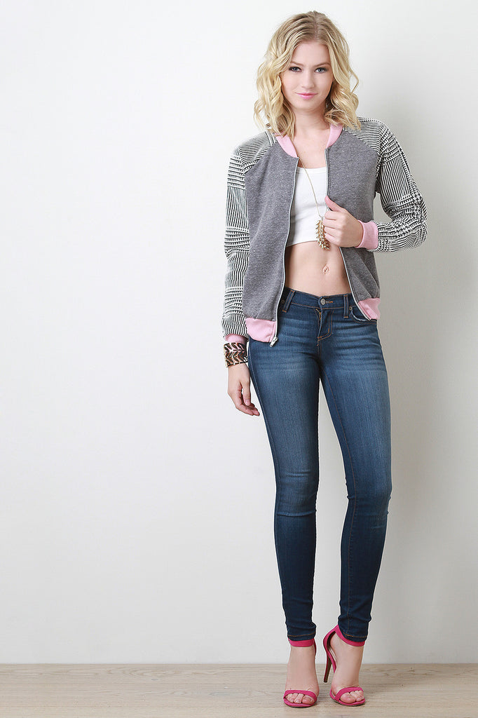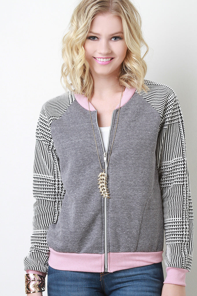 This cozy varsity inspired jacket features gird sleeves, pink ribbed knit trim, side pocket, and zipper front. Accessories sold separately. Made in U.S.A. 88% Polyester, 9% Rayon, 3% Spandex. Contrast: 48% Polyester, 48% Rayon, 4% Spandex.