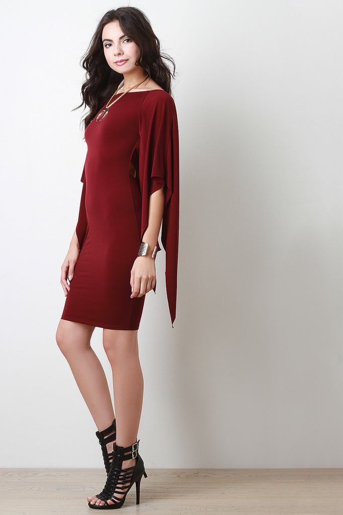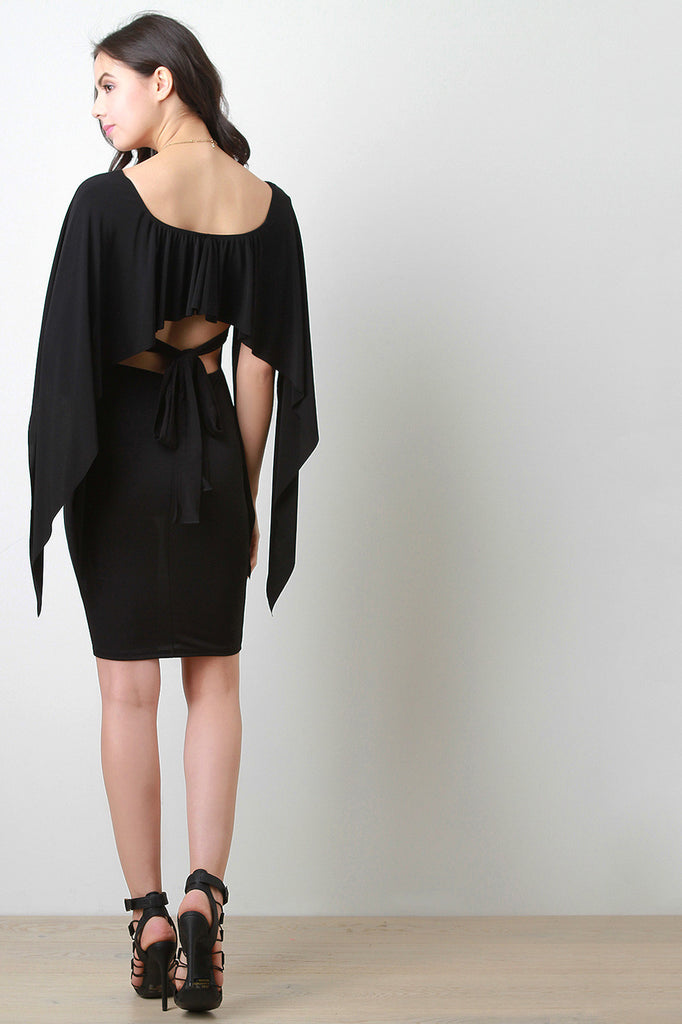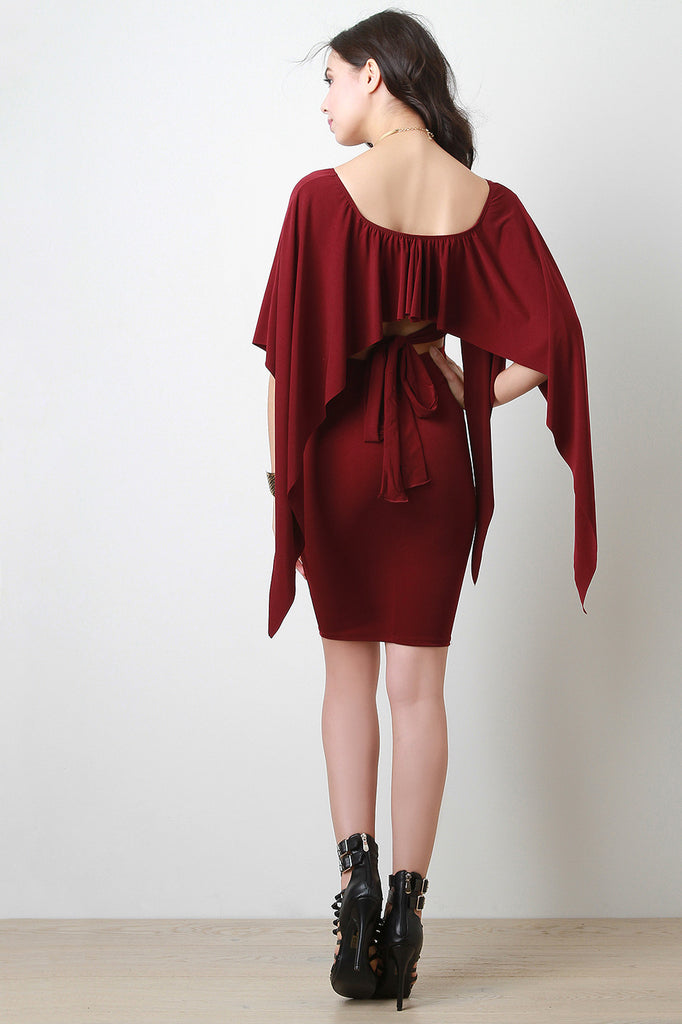 This ong handkerchief sleeves . Back has a cropped ruffled layer connected to the sleeves and a self-tie bow across the cutout section. Unlined. Accessories sold separately. Made in U.S.A. 96% Polyester, 4% Spandex.