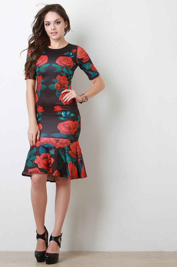 This dress features smooth stretch fabric, rose print throughout, round neckline, short sleeves, back zipper closure, and finished with peplum hem. Accessories sold separately. Made in U.S.A. 96% Polyester, 4% Spandex.