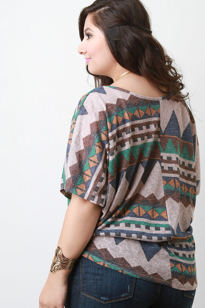 This semi-sheer knit top features a loose fit, scooped v-neckline, dropped shoulders with short dolman sleeves, and a tribal triangle pattern throughout. Unlined. Accessories sold separately. Made in U.S.A. 78% Polyester, 22% Rayon.