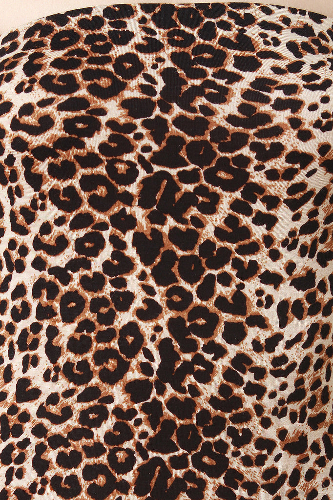 This midi dress features a strapless elasticized tube neckline, stretchy sculpture silhouette fit, and cheetah pattern print throughout. Accessories sold separately. Made in U.S.A. 95% Polyester, 5% Spandex.